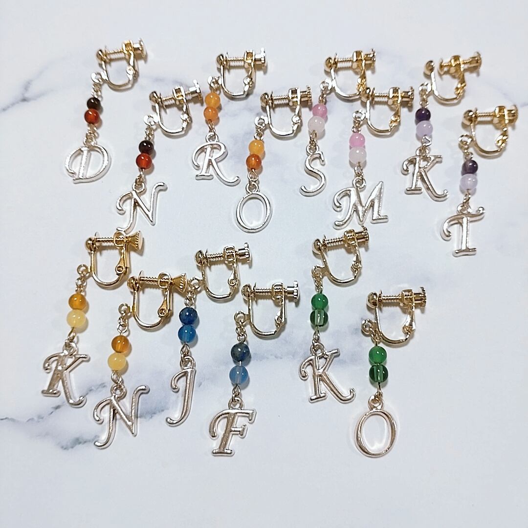 なにわ男子のメンバーのイニシャルをメンバーカラーの天然石と合わせてイヤリングにしました
