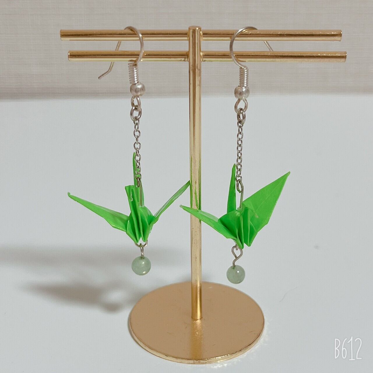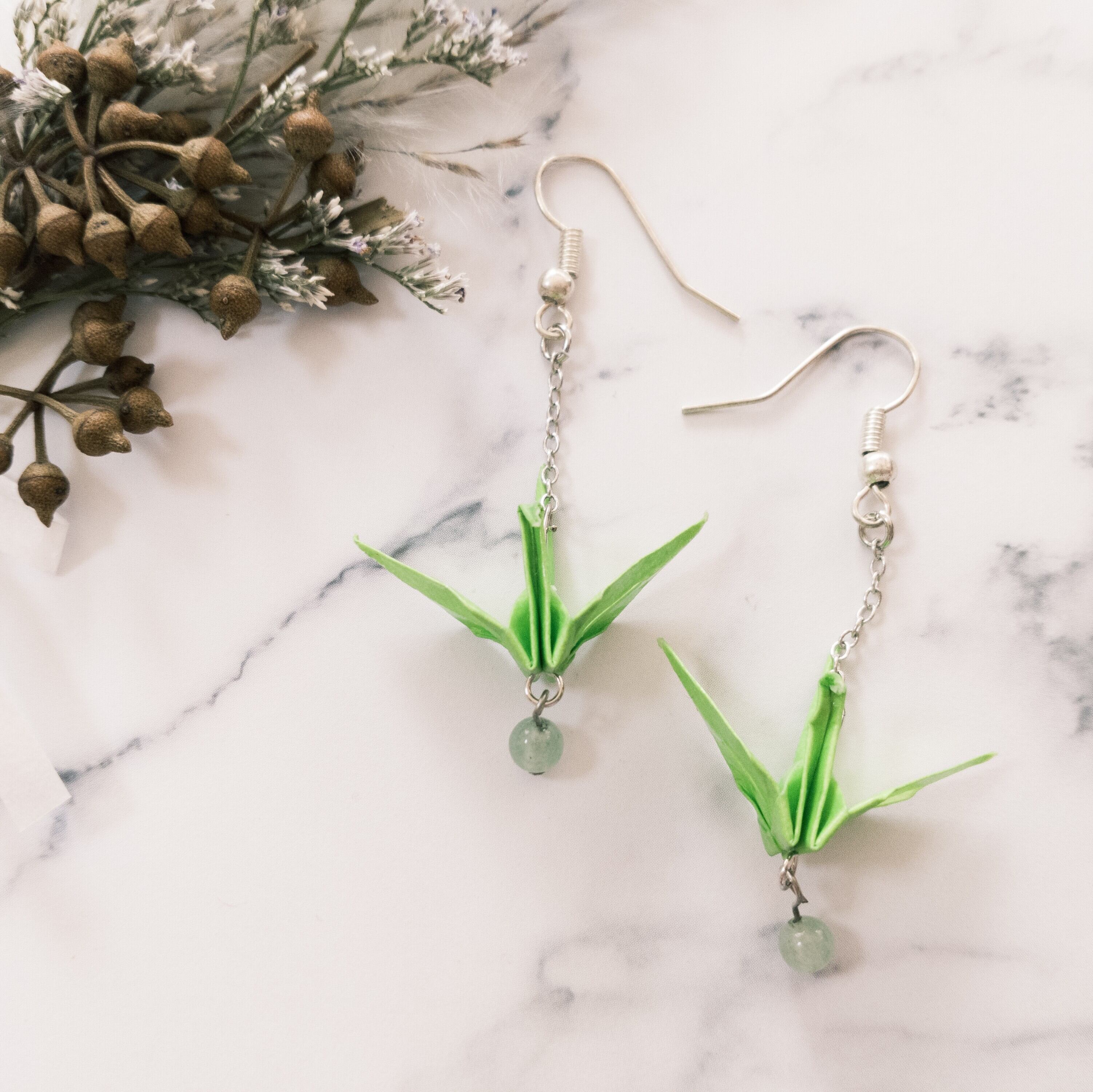 その折り鶴を天然石のニュージェイドと合わせてピアスにしました
