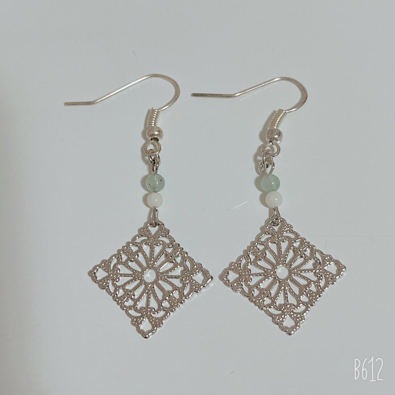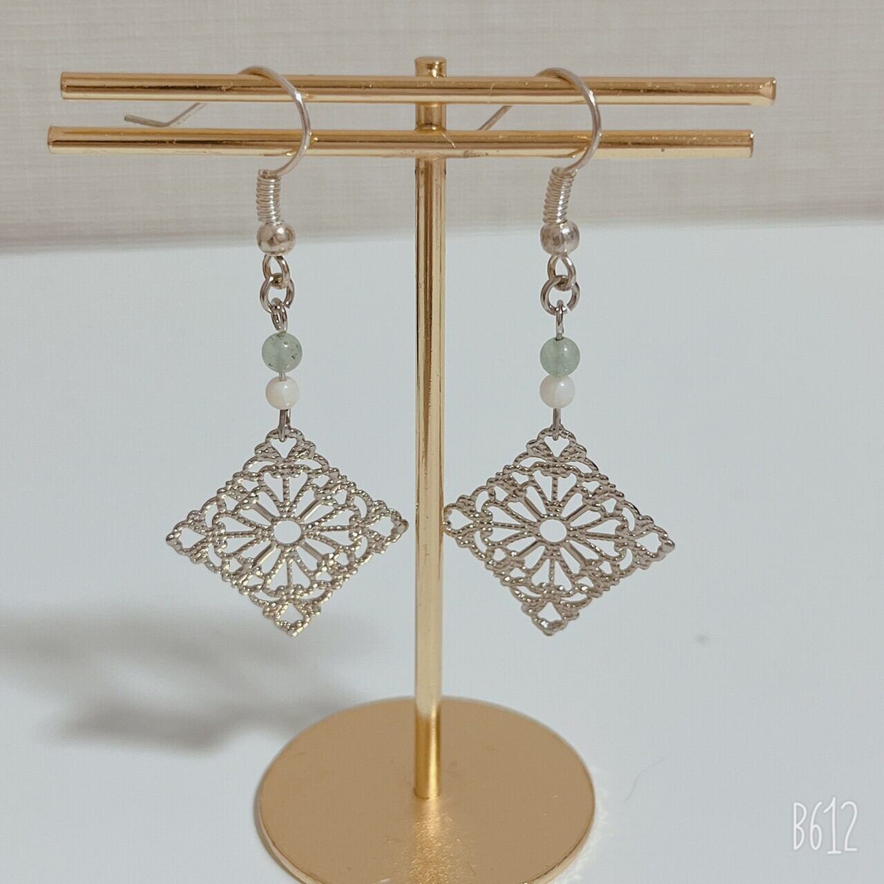 シルバーのレース調パーツに天然石のビーズを合わせて作りました