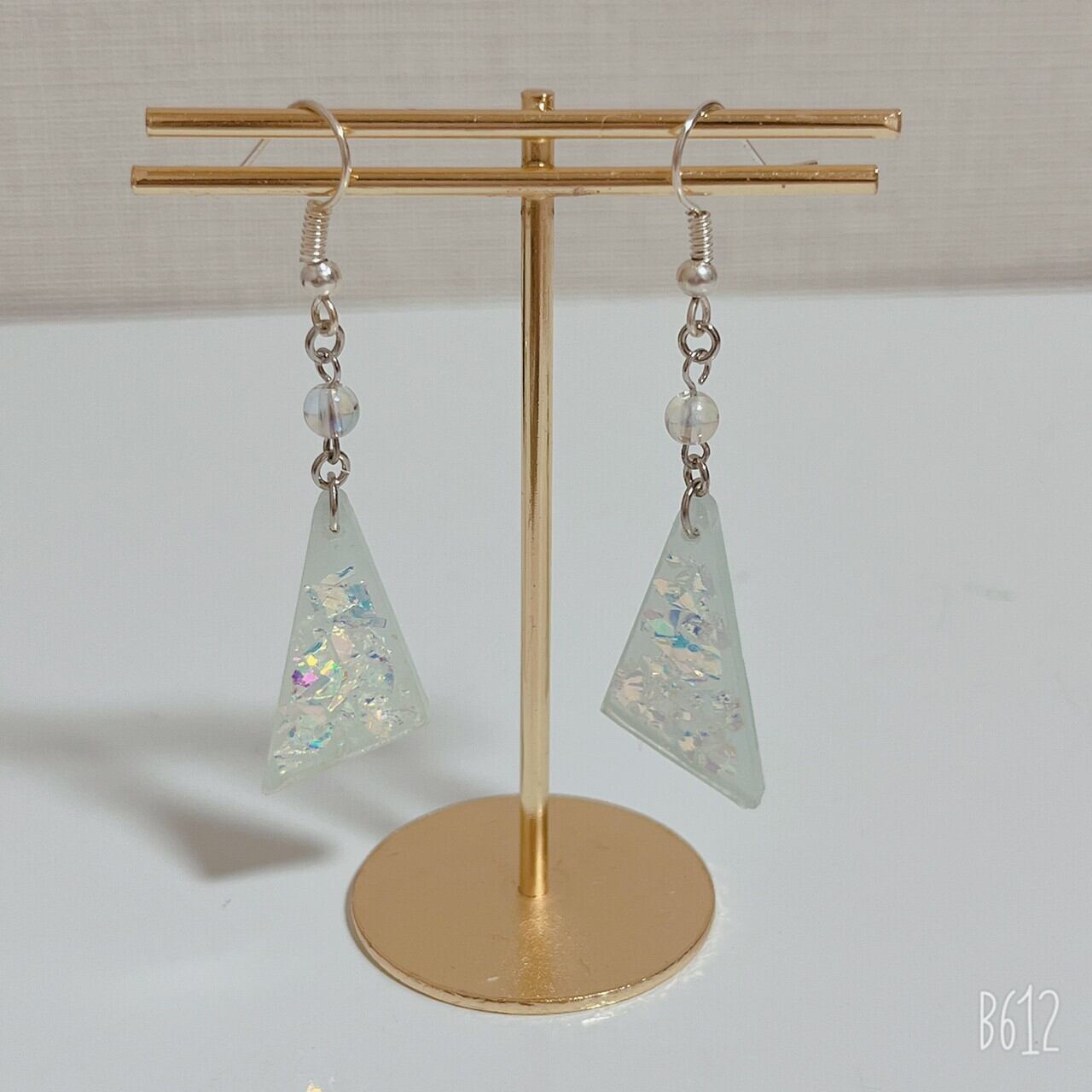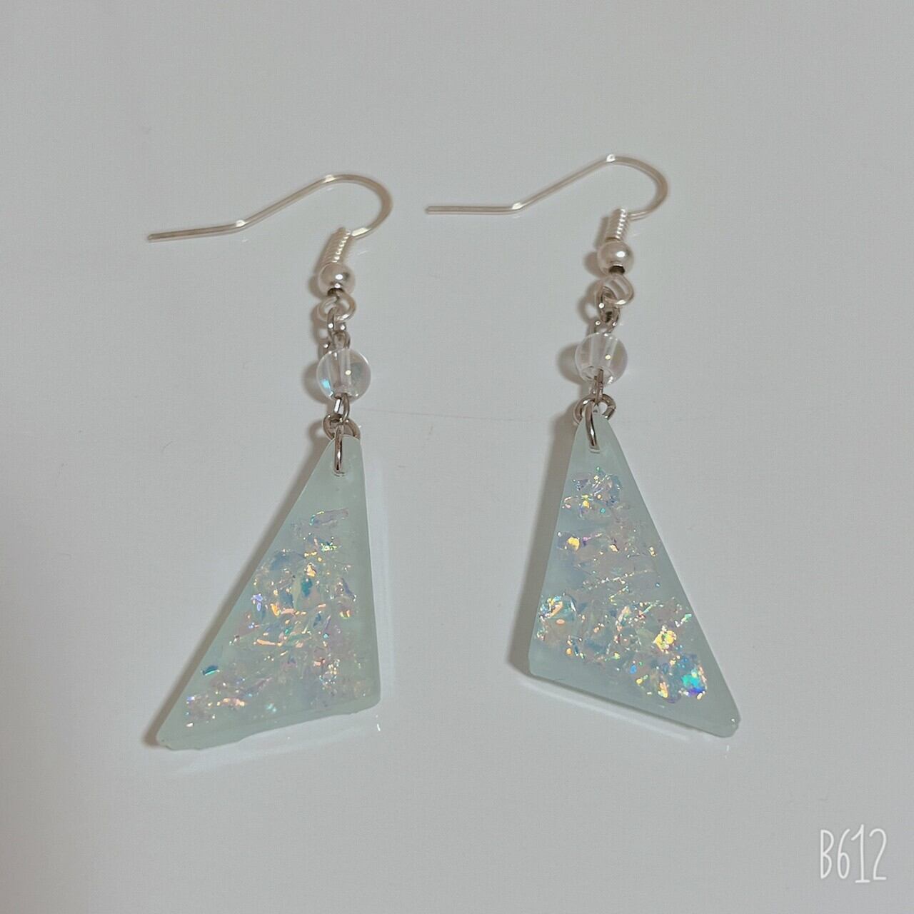 水色のレジンにホログラムを封入して作ったチャームに天然石のオーロラ水晶のビーズを合わせて作りました
