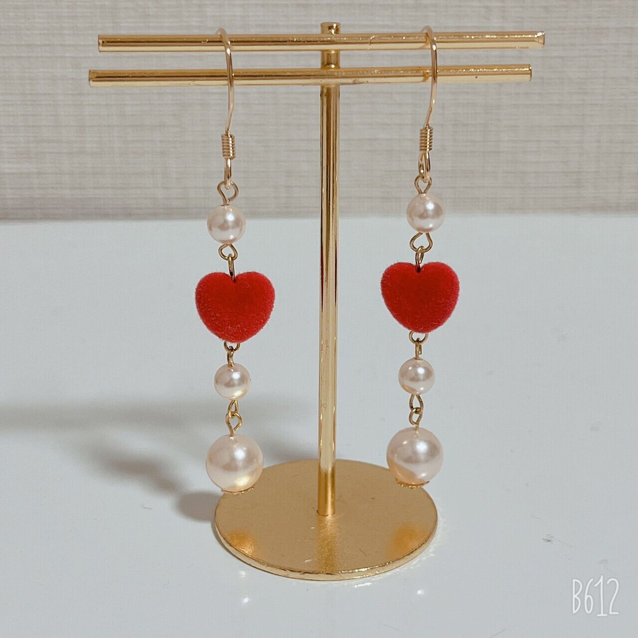 赤のハートのフロッキービーズとパールを合わせて作りました