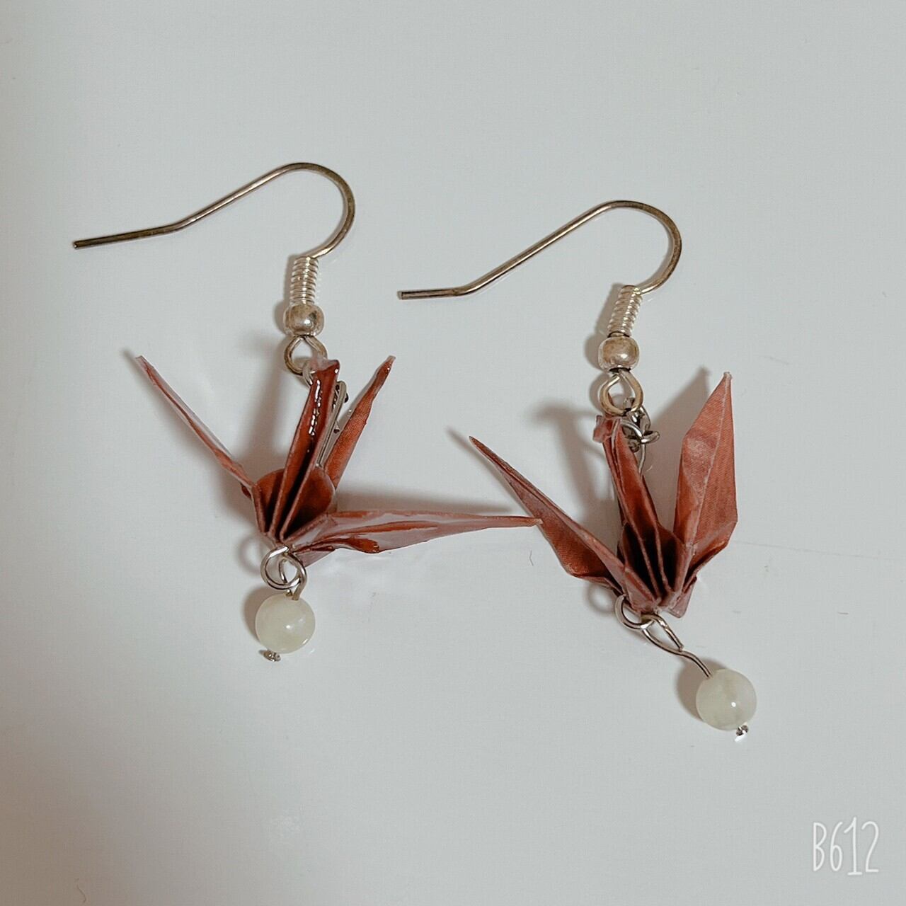 その折り鶴を天然石のビーズと合わせてピアスにしました
