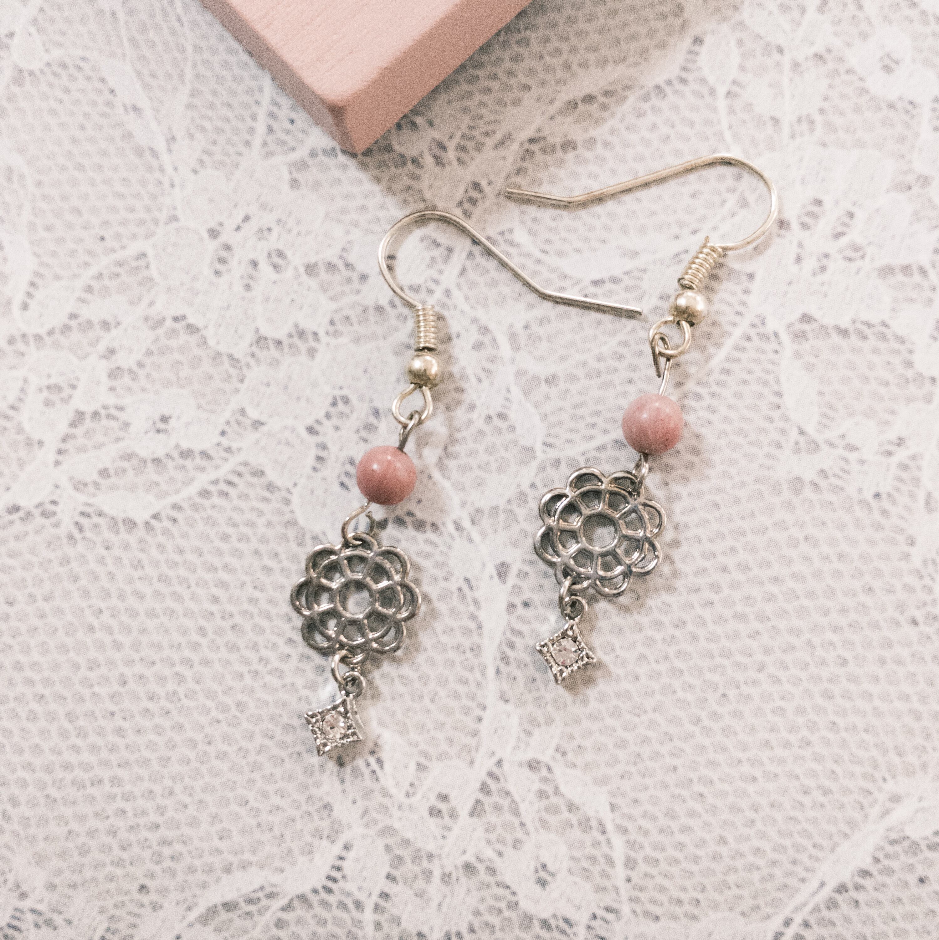 レース調のお花パーツと天然石のビーズ、クリスタルチャームと合わせて作りました