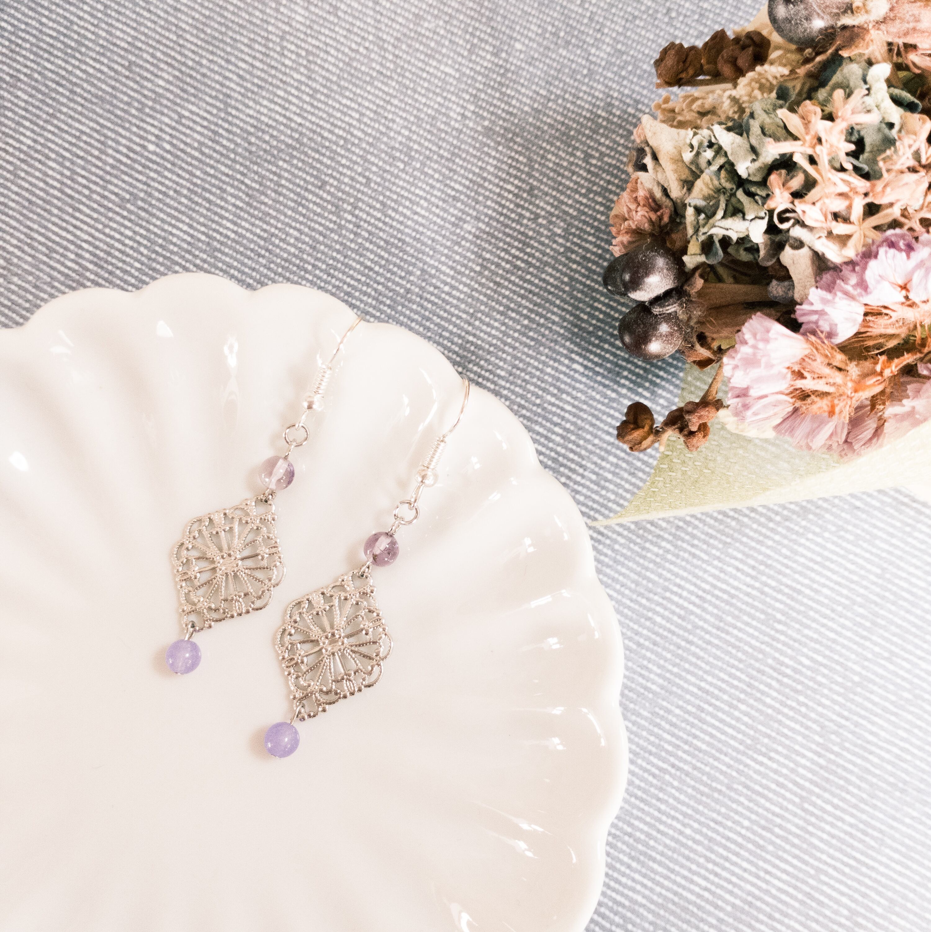 レース調のシルバーのパーツに紫系の天然石ビーズを合わせてピアスにしました