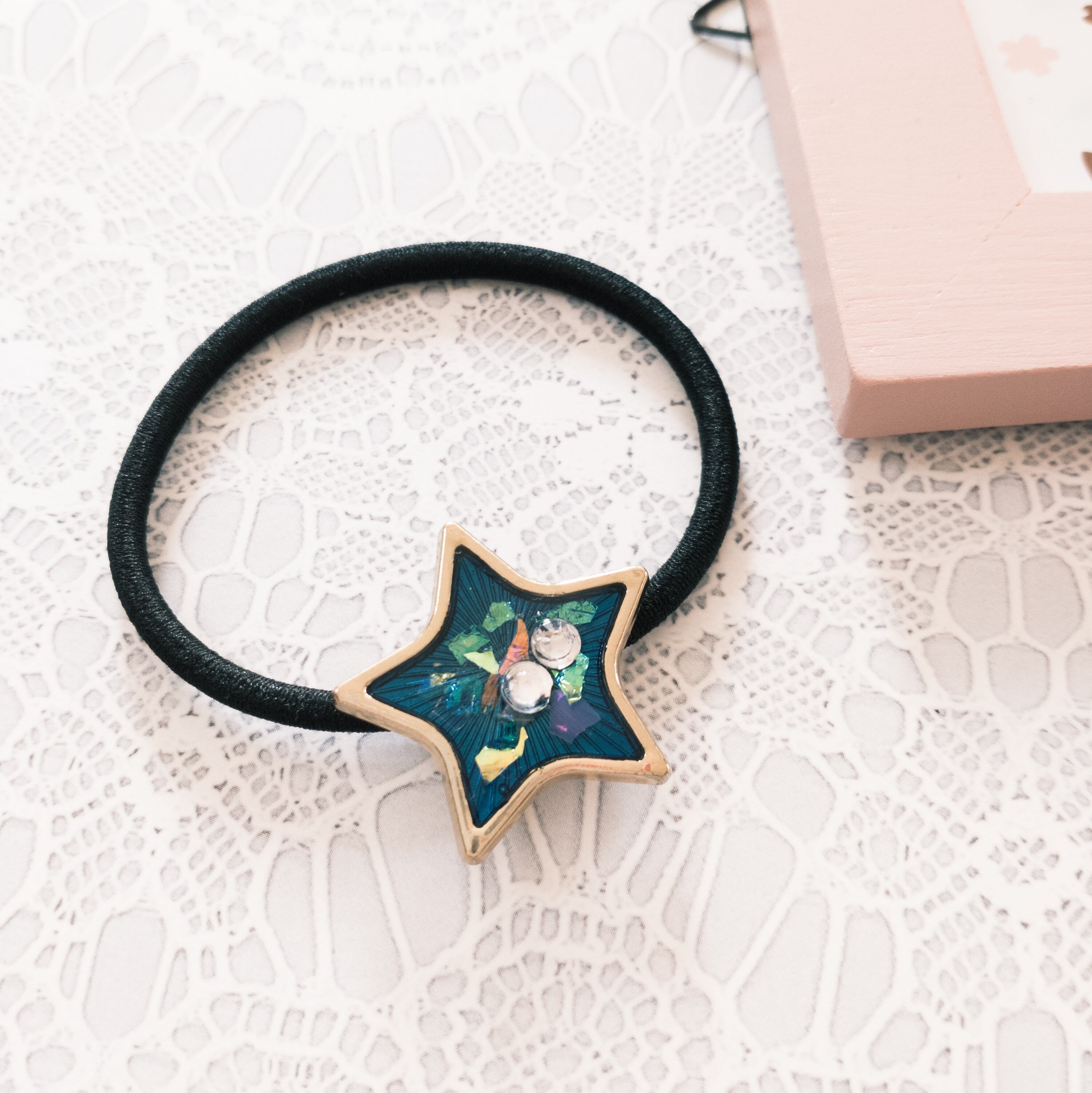 青く着色したレジンにホログラムやラインストーンを封入して星の形のヘアゴムを作りました