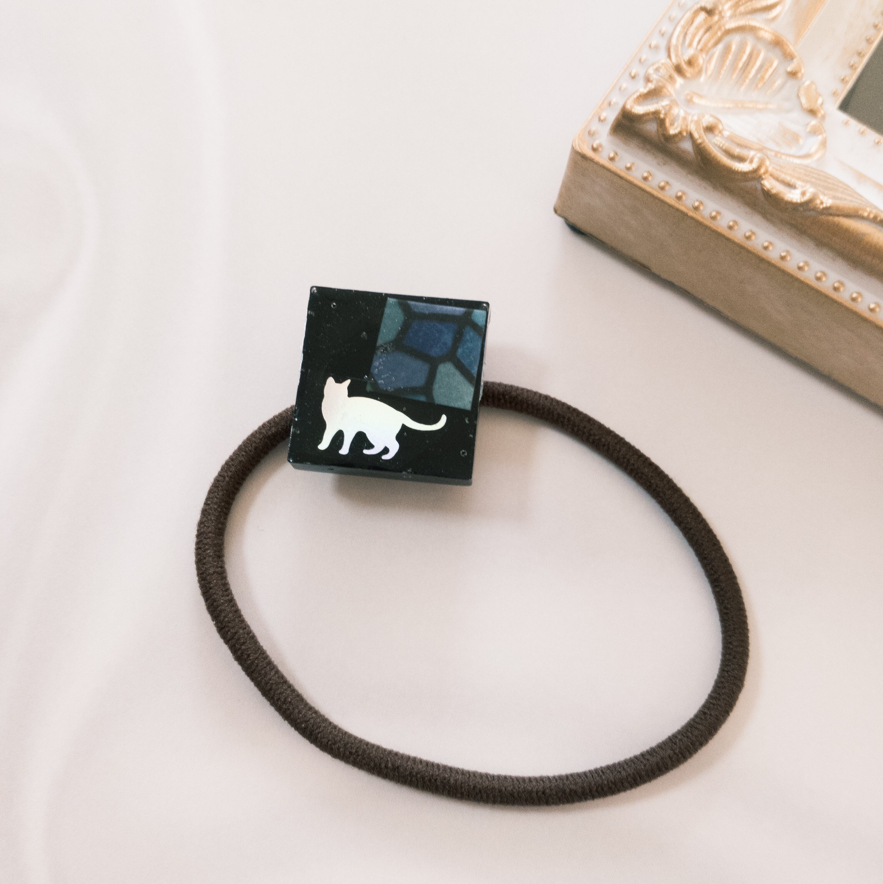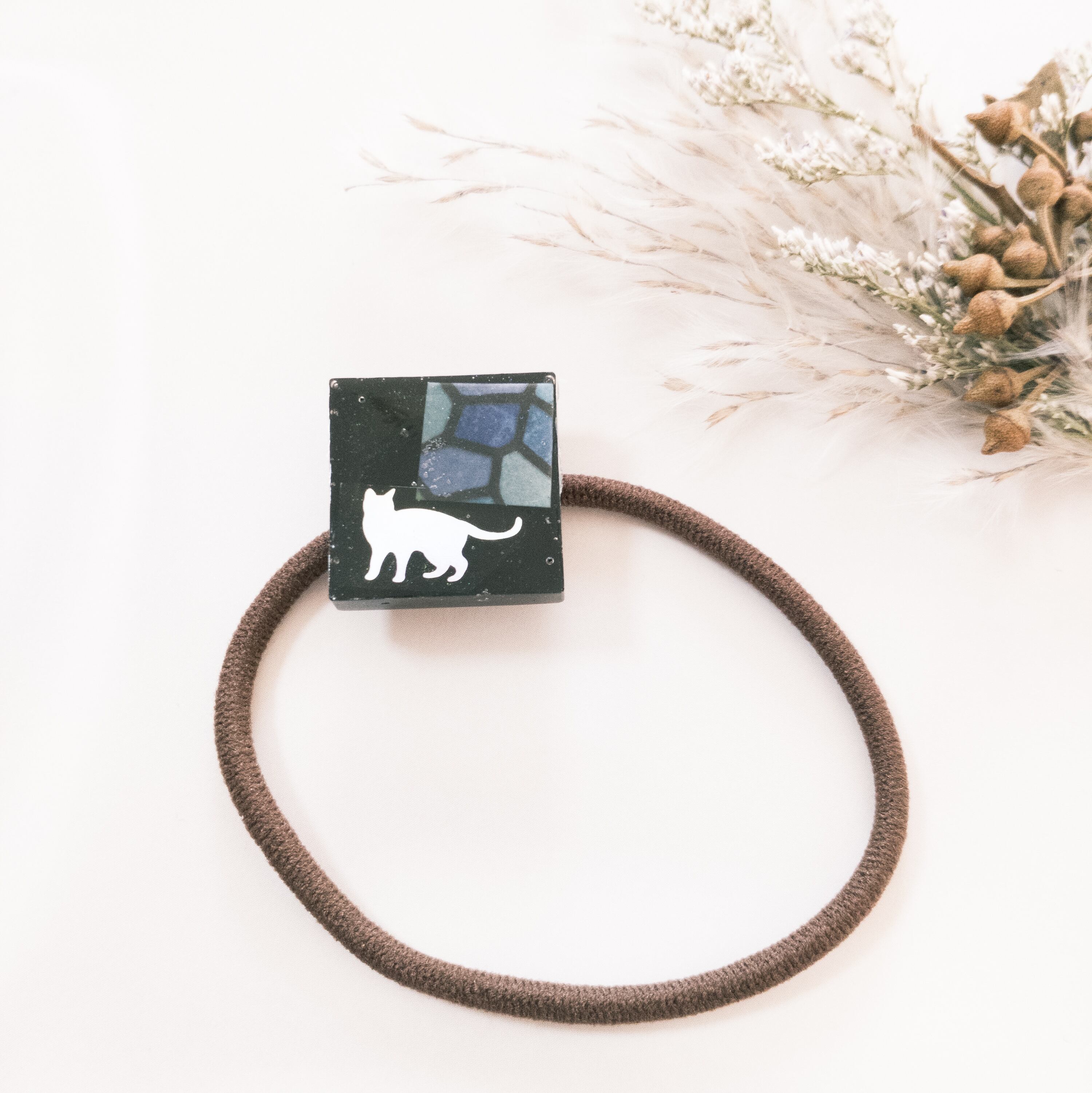 黒のレジンを土台にシルバー系のホログラム調のネコと柄を封入してヘアゴムにしました