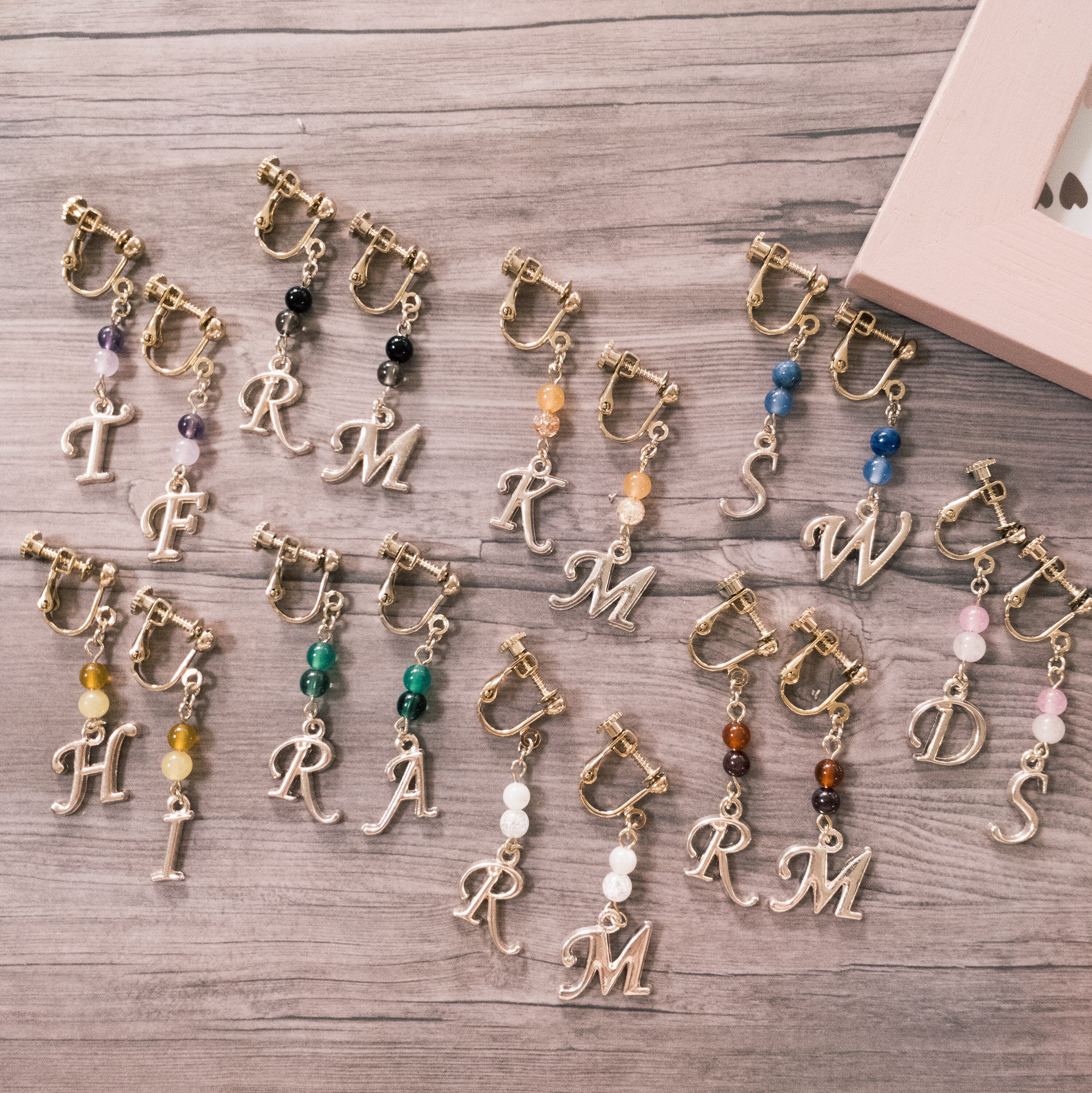 Snow Manのメンバーのイニシャルをメンバーカラーの天然石と合わせてイヤリングにしました